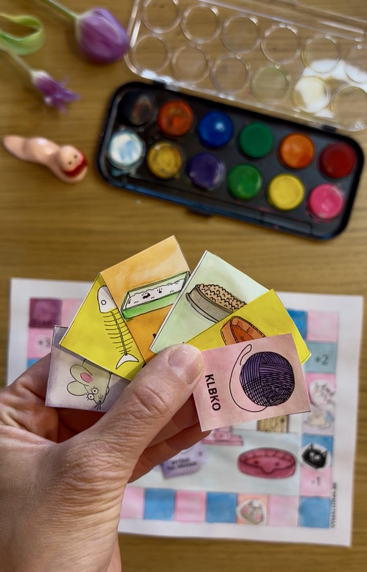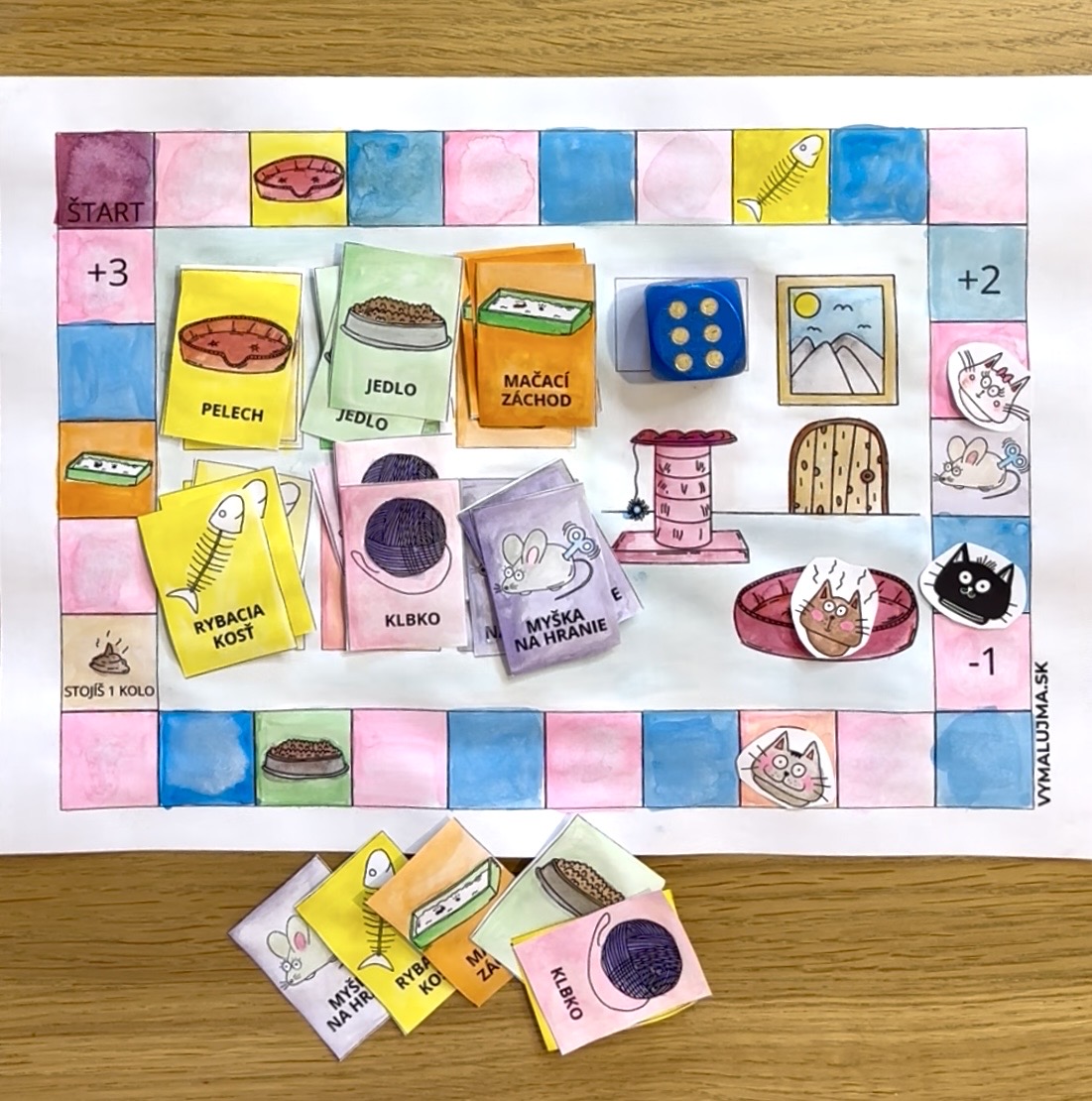 But watch out—the board is full of surprises! Along with the occasional "poop" tile, you might run into a troublemaker. If you land on one, you have to return all your cards and start from square one. So, pick your favorite cat and let the adventure begin! As a finishing touch, the winner gets to place their kitty right into the cozy bed on the game board.