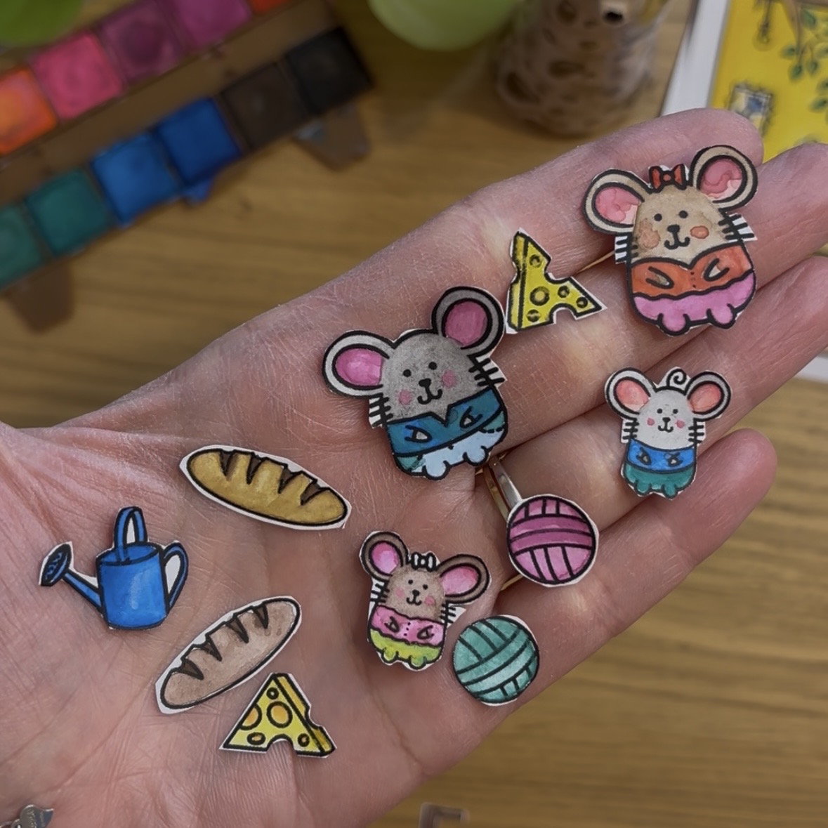 The little mice with baguettes, cheeses, watering cans, ball, and benches are available for download in PDF format below.