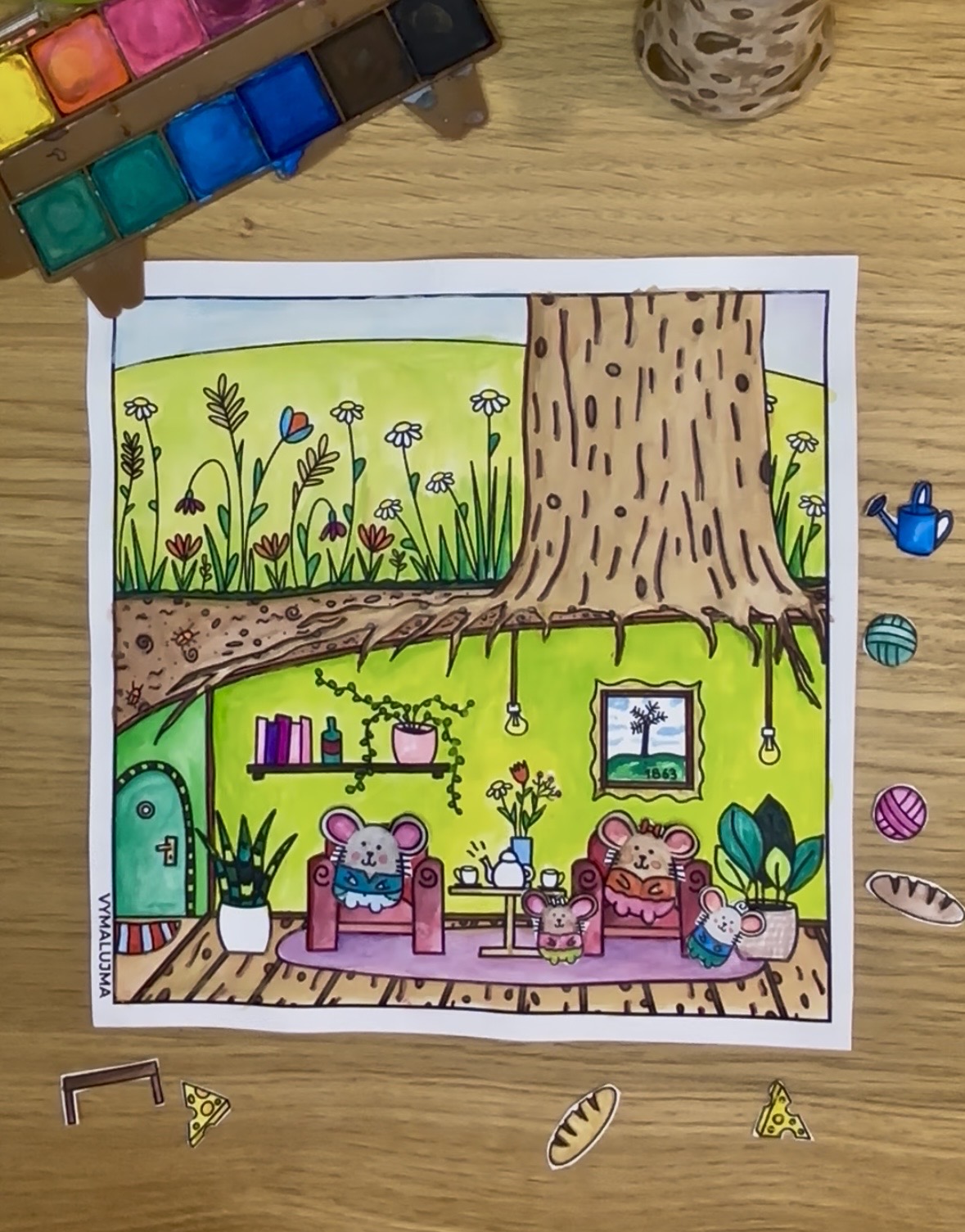 The mice love living in the little house under the tree, but they won't say no to a house that you draw for them. They are part of the coloring pages from the "Secret of the tree" collection. After coloring them, children (and adults too) can play with the mice in the house. To make the figures last as long as possible, I recommend covering them with adhesive tape after coloring, or laminating them.